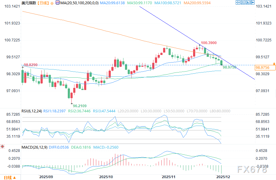 "等待的煎熬更甚于此"。唐纳德·特朗普此前表示,新美联储主席人选将在2026年初公布,而非斯科特·贝森特此前预测的圣诞节前,这一消息并未对美元形成支撑。加之市场预期凯文·哈塞特将出任美联储主席,对货币政策宽松规模的预期持续升温,这对美元而言无疑是利空消息。